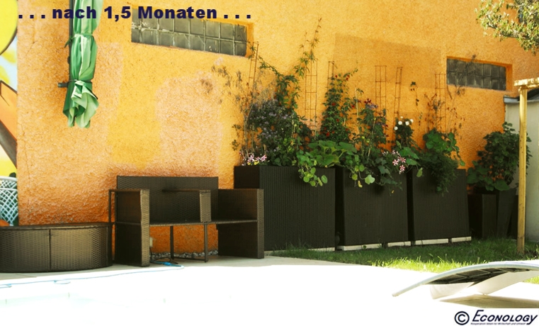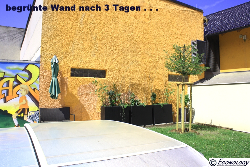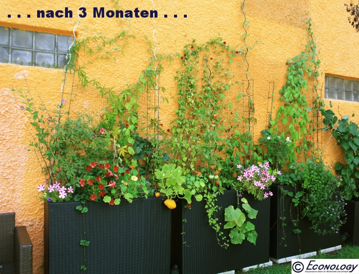 Die dargestellte Begrünung der an einen Garten eines Mehrparteienhauses angrenzenden Wand sollte u.a. ein Kräuter-, Pflück- und Nutzgarten sein . . .